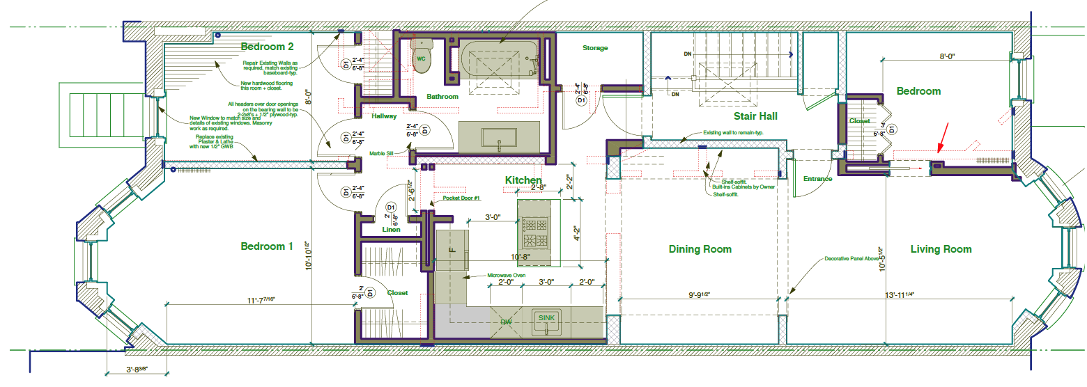On the main ‘Parlor’ floor, which would be the Owner’s ‘starter unit’, the need was for two bedrooms, and larger bathroom, and an open kitchen, dining and living room, all complimented with extra closet space to the extent possible.